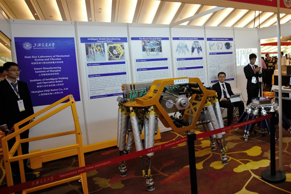 此次参展的两款腿式步行机器人结构新颖,瞄准未来机器人教育和智能制造领域。教育机器人趣味性强,适合高等院校在机器人教学中使用,作为复杂路面行走、自主导航、人机交互等的智能控制平台;另外一款用于智能制造的新型六足机器人反映了移动制造思想,适用于大型/超大型特殊工件的移动加工作业。两款机器人的现场演示受到了众多相关领域专家学者的关注以及多家新闻媒体报道,Science杂志Robotics子刊在其官方推特上对这两款机器人也作了特别推荐。